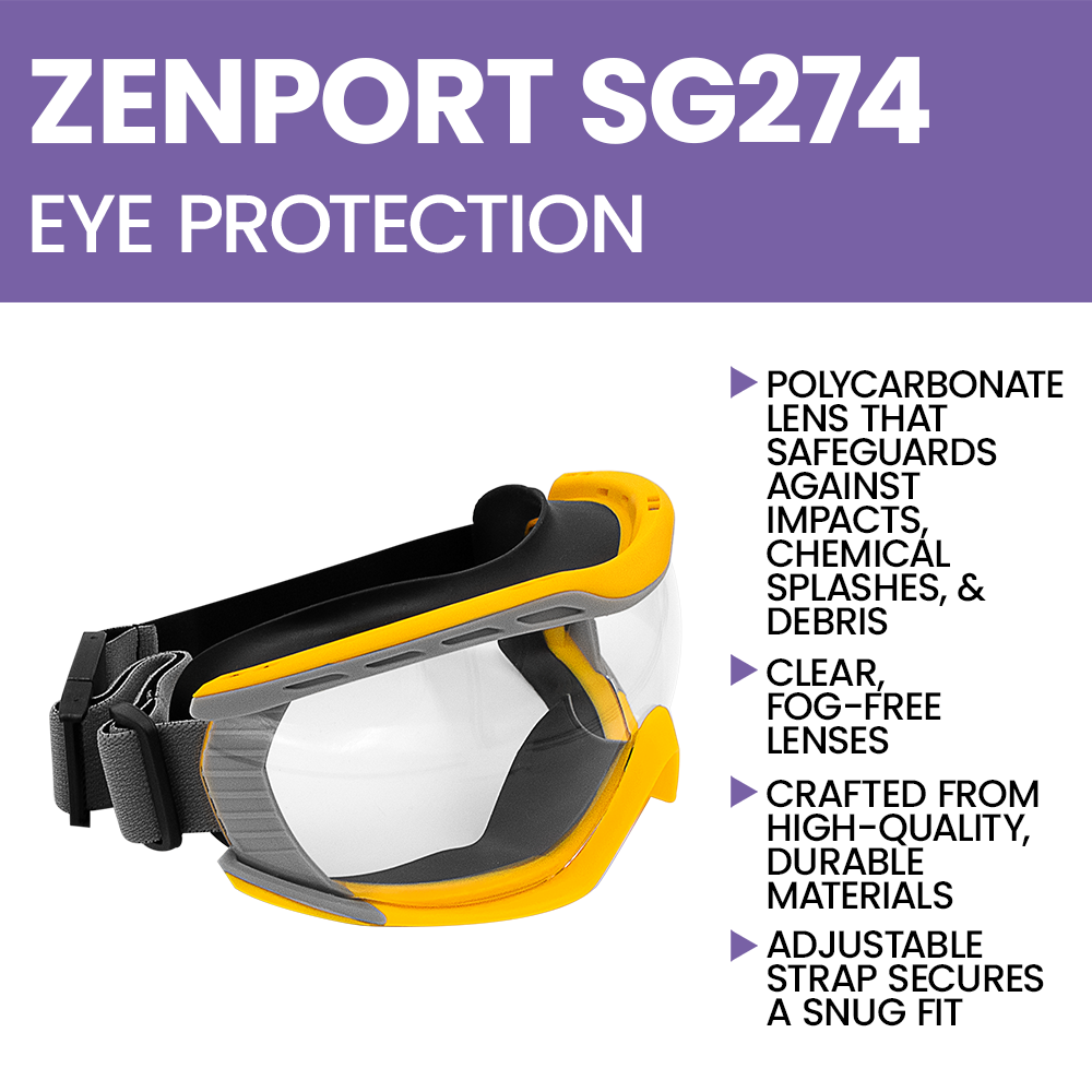 Zenport SG274 Safety Goggles Clear Lens, Flex Seal, Yellow are a reliable and versatile solution for protecting your eyes during various tasks. Designed with comfort and durability in mind, these goggles feature a vented polycarbonate lens that safeguards against impacts, chemical splashes, and debris. Whether you’re working in industrial environments, laboratories, or outdoor settings, the lightweight body and flexible silicone seal ensure a secure, comfortable fit that conforms perfectly to your face.